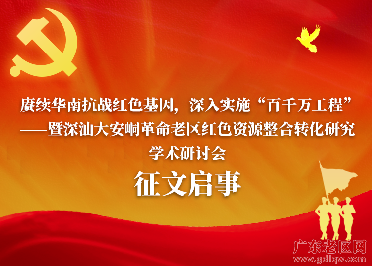 为纪念中国人民抗日战争暨世界反法西斯战争胜利80周年,结合中共广东省委“百千万工程”的重要部署,广东南方红色文化研究院联合广东省老区建设促进会、羊城晚报社、深圳市深汕特别合作区组织人事局、华南师范大学马克思主义学院等单位,举办“赓续华南抗战红色基因,深入实施‘百千万工程’——暨大安峒革命老区红色资源整合转化学术研讨会”。现面向全国高校、党校、研究单位专家学者及社会公开征文。